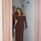 Vestido largo off shoulder de manga larga, color marrón con pedrería. La tela es estira y tiene cierre de lado. Perfecto para eventos en otoño e invierno. La modelo usa la talla S y mide 1.72 cm.